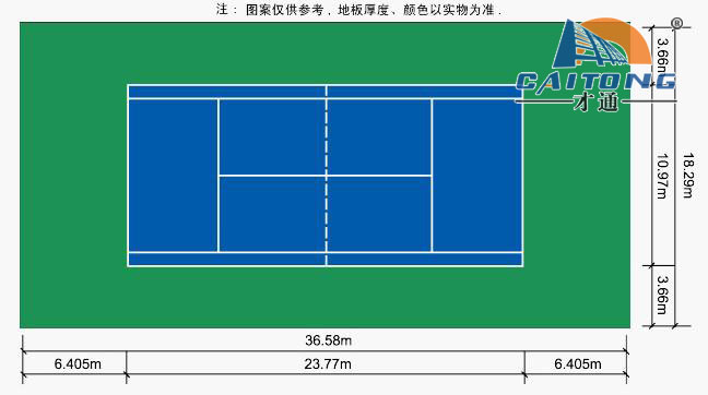 一片標(biāo)準(zhǔn)的網(wǎng)球場(chǎng)地,占地面積應(yīng)不小于670㎡(長(zhǎng)36.60米、寬18.30米),其中雙打場(chǎng)地標(biāo)準(zhǔn)尺寸為長(zhǎng)23.77米、寬10.97米。如果是兩片或兩片以上相鄰而建的并行網(wǎng)球場(chǎng)地,兩片場(chǎng)地之間距離應(yīng)不小于5米。